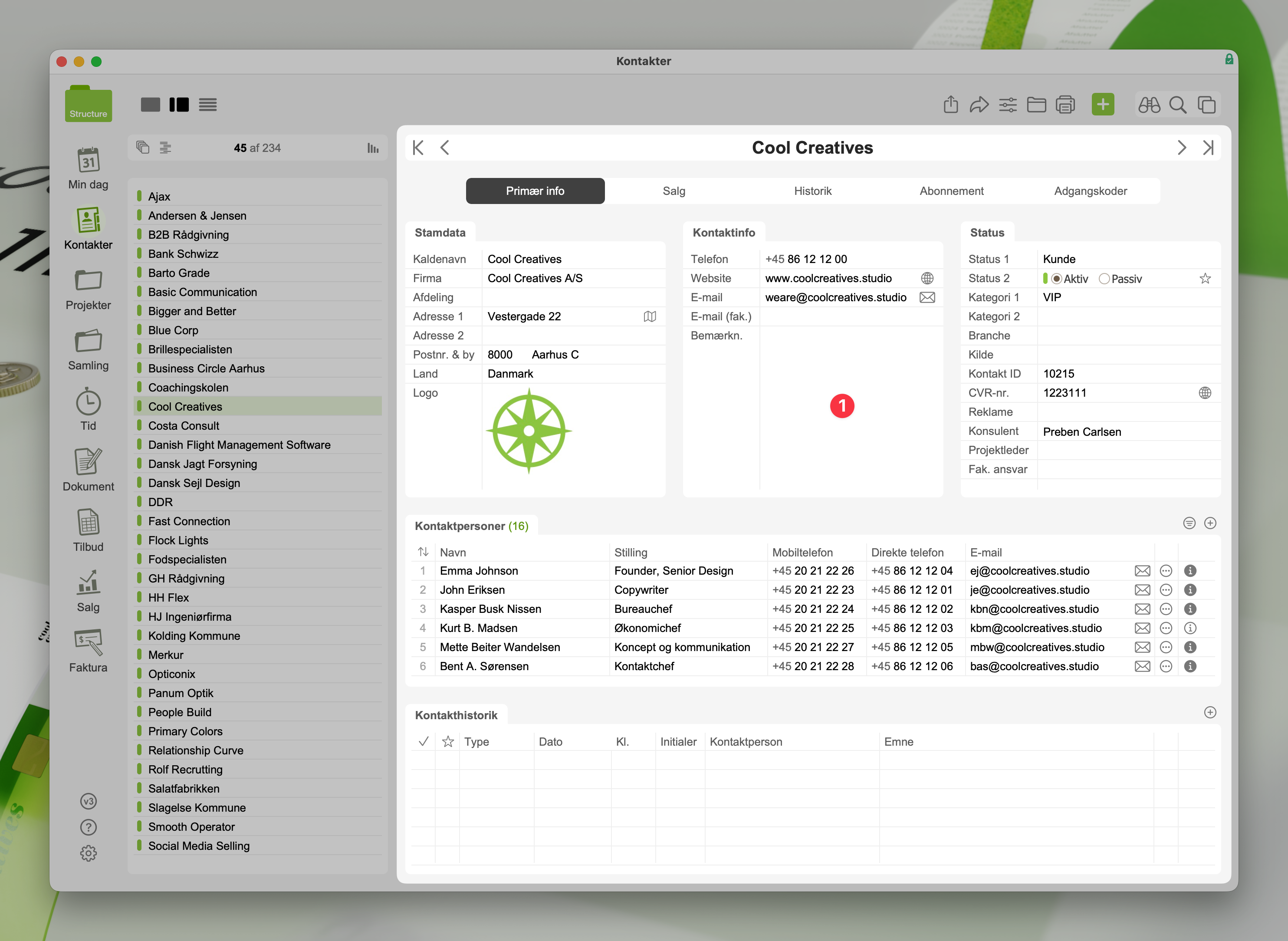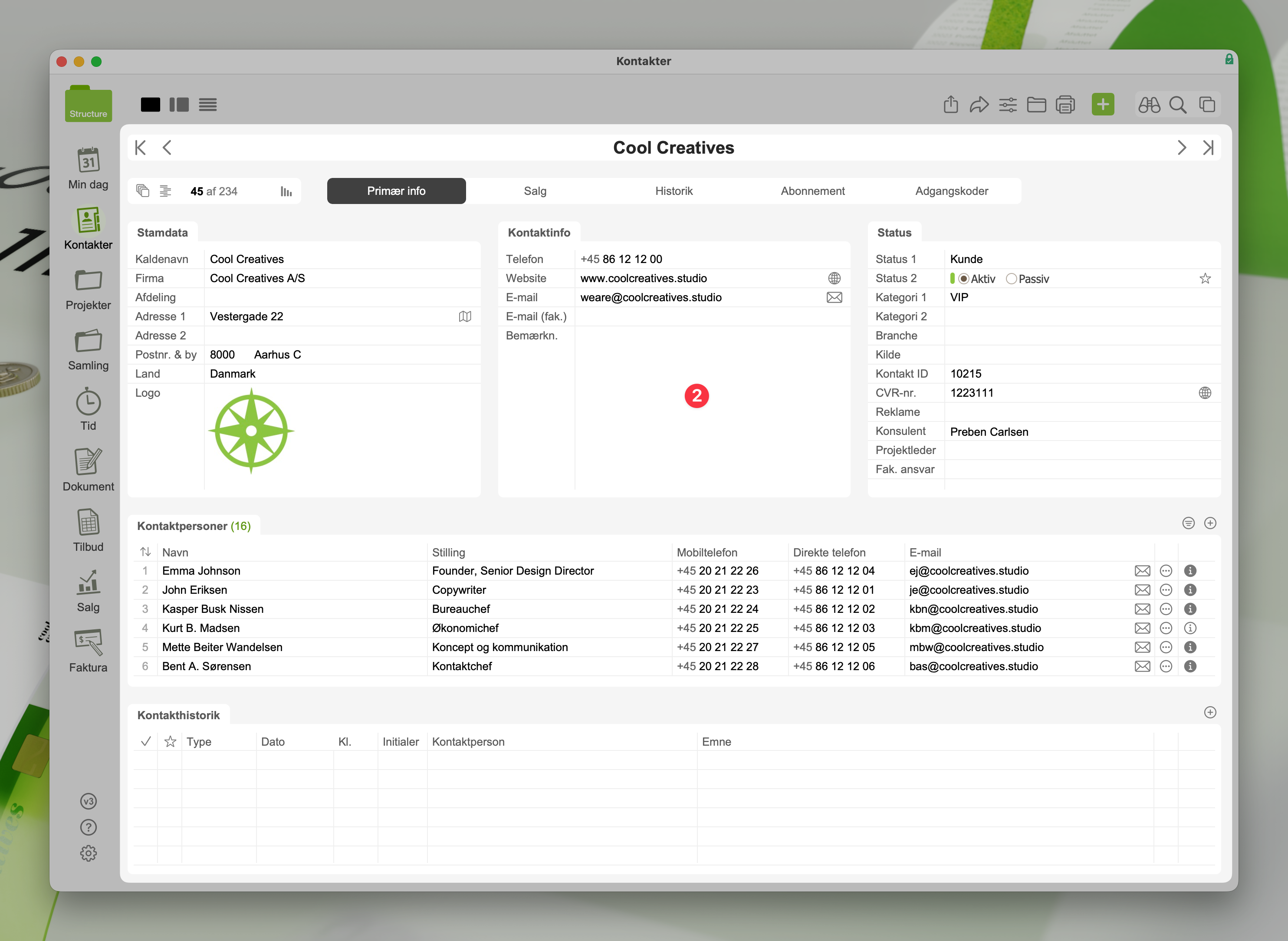 Nedenfor ser du to screenshots af et kort for en virksomhed (Cool Creatives) i modulet Kontakter. Alt vedr. denne virksomhed befinder sig på dette kort (kortindholdet er fremhævet).