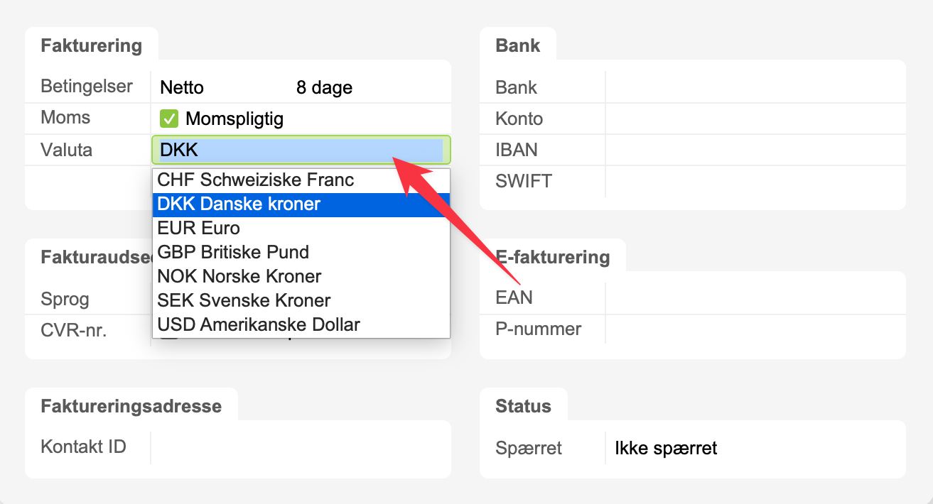 2. Valuta er et eksempel på en dropdown-menu, hvor du styrer indholdet fra SystemindstillingerValuta.