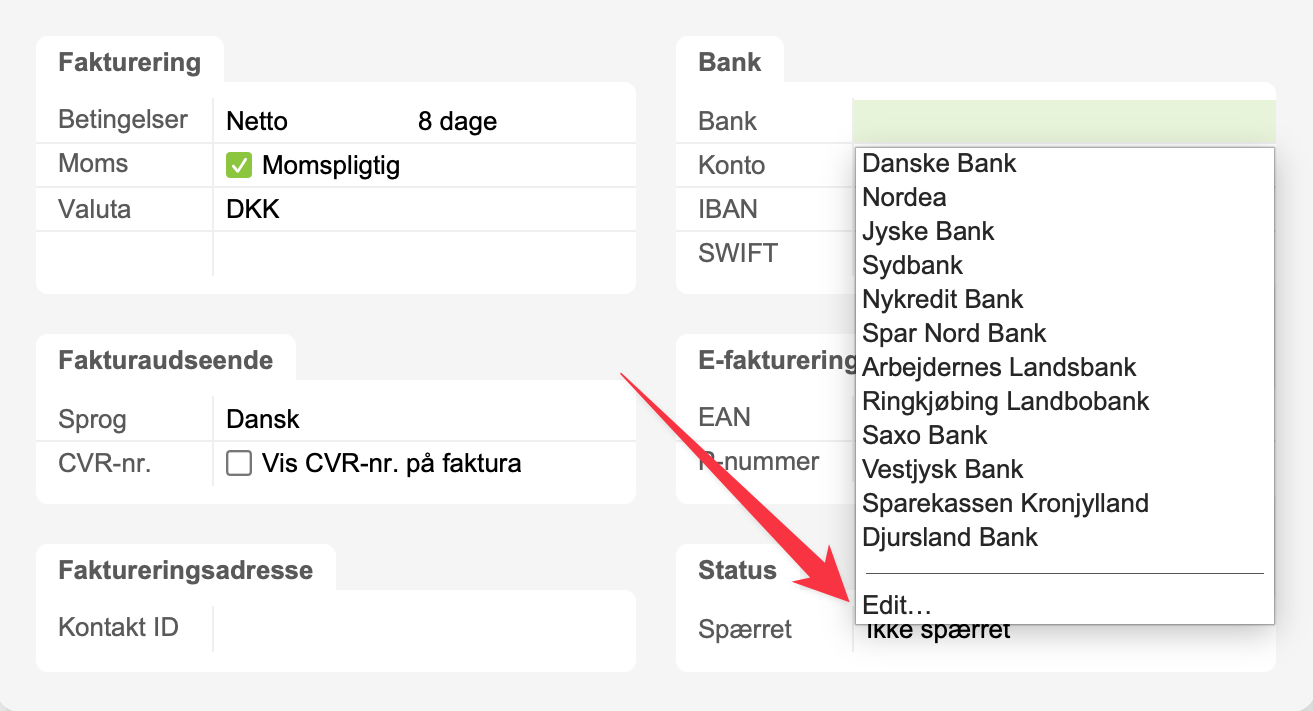 3. Hvis du ændrer i en dropdown-menu via Edit (f.eks. erstatter du "Jutlander Bank" med "Sparekassen Danmark"), så vær opmærksom på, at andre kort, som har den oprindelige værdi, ikke får ændret indholdet i feltet.