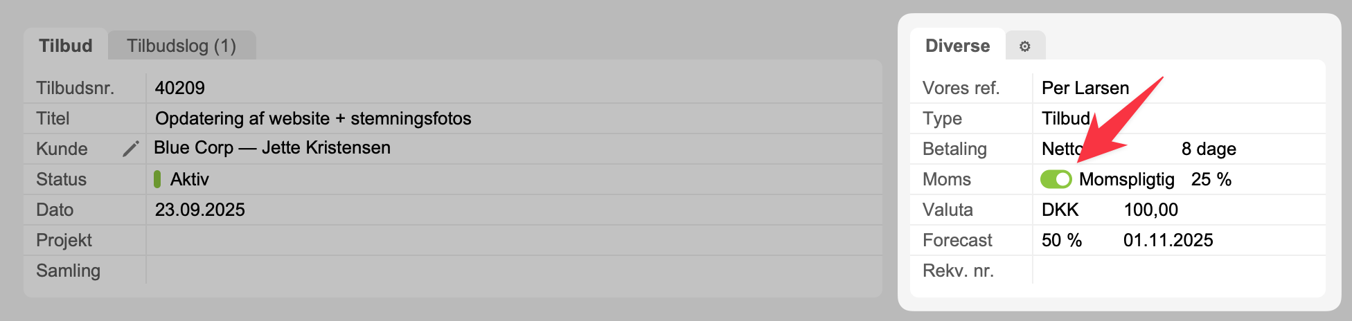 Eksempel på aktiveringsfelt i Tilbud-modulet