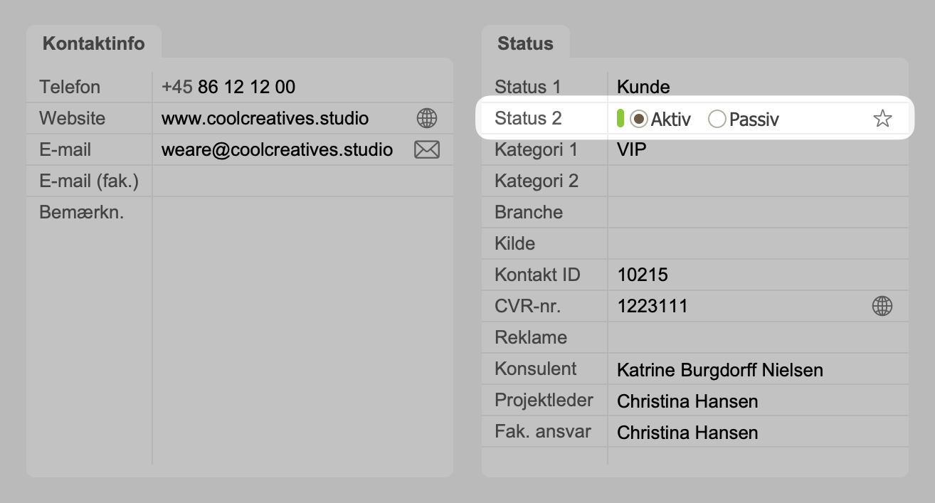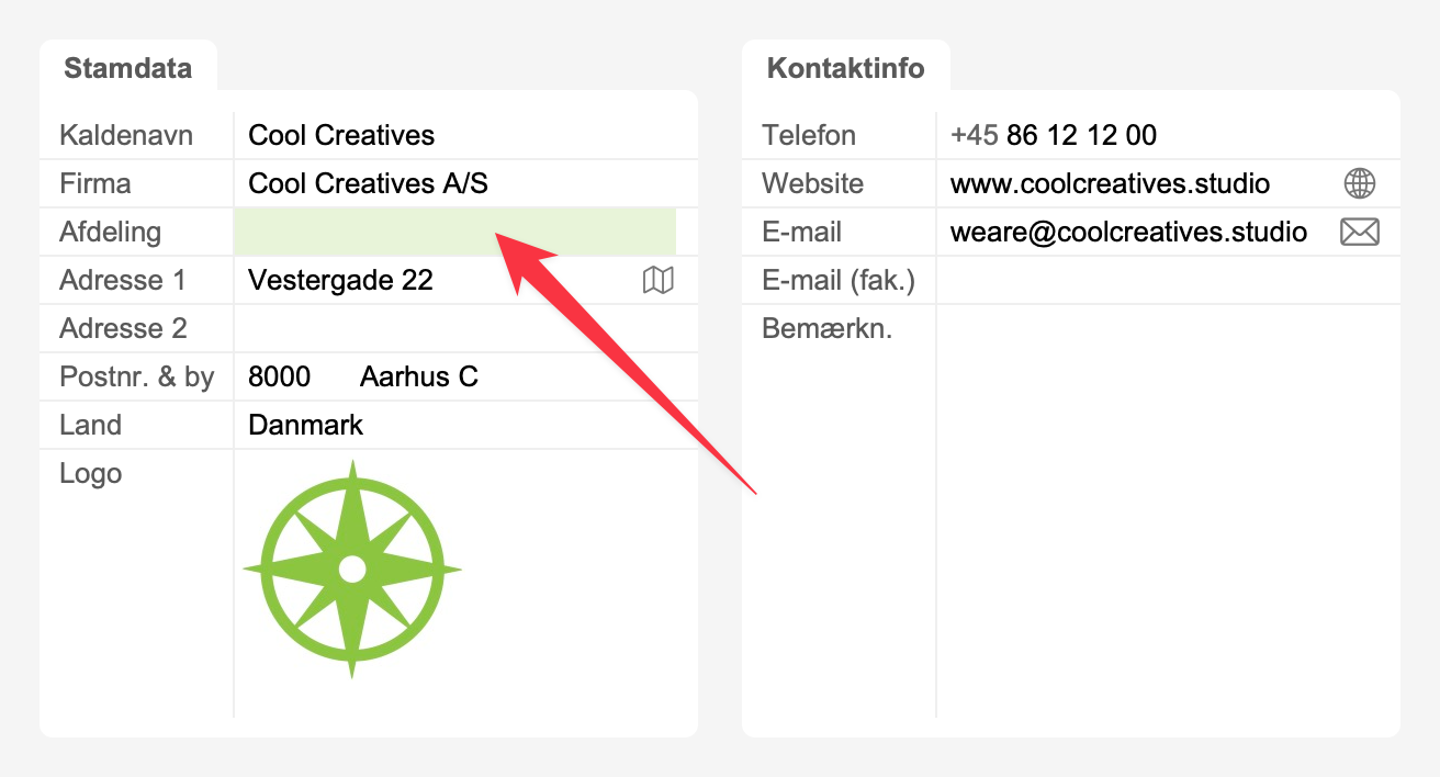 Eksempel på felt med redigérbar dropdown-menu i Kontakt-modulet