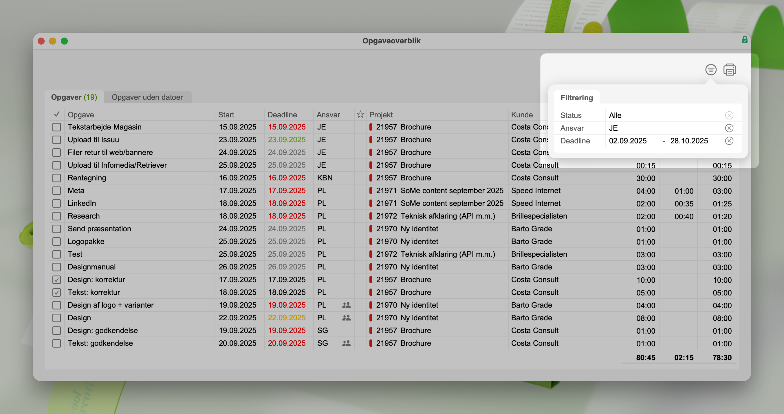 Nedenfor ser du overblikket Opgaveoverblik. Ved at klikke på kan du her filtrere efter status, ansvarlig og deadline.