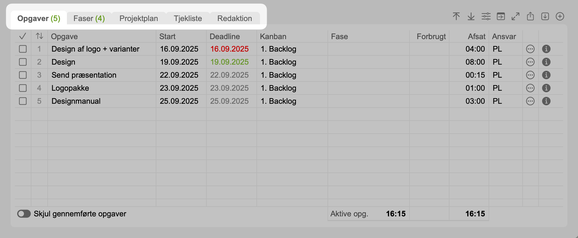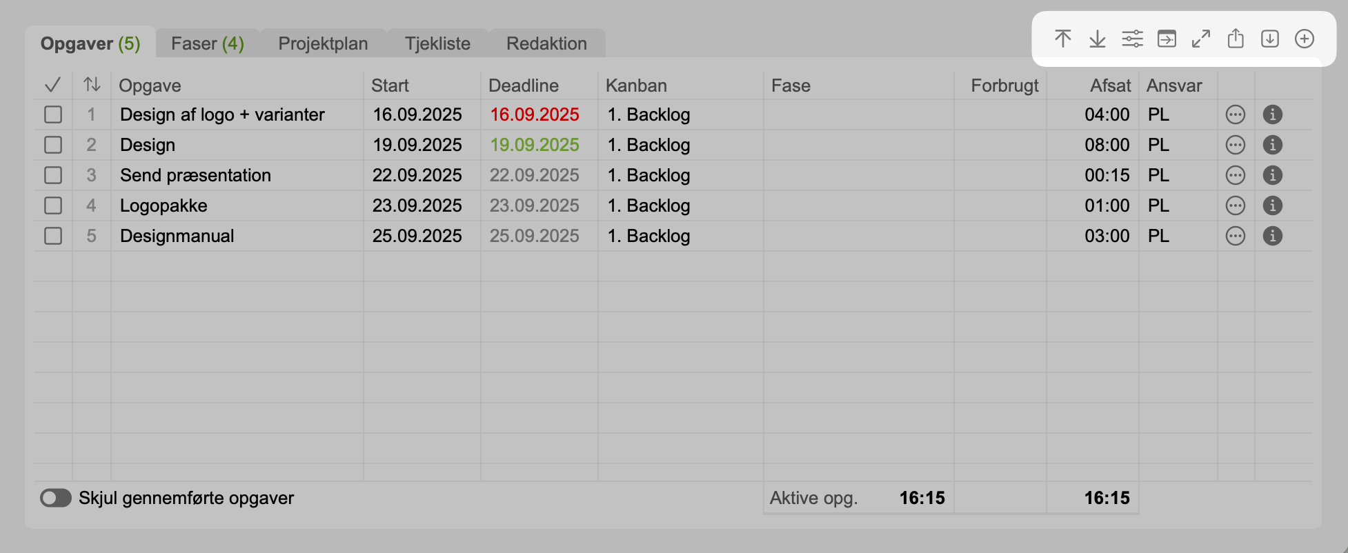 I det viste eksempel ser du otte knapper i fanen for Opgaver i modulet Projekter.