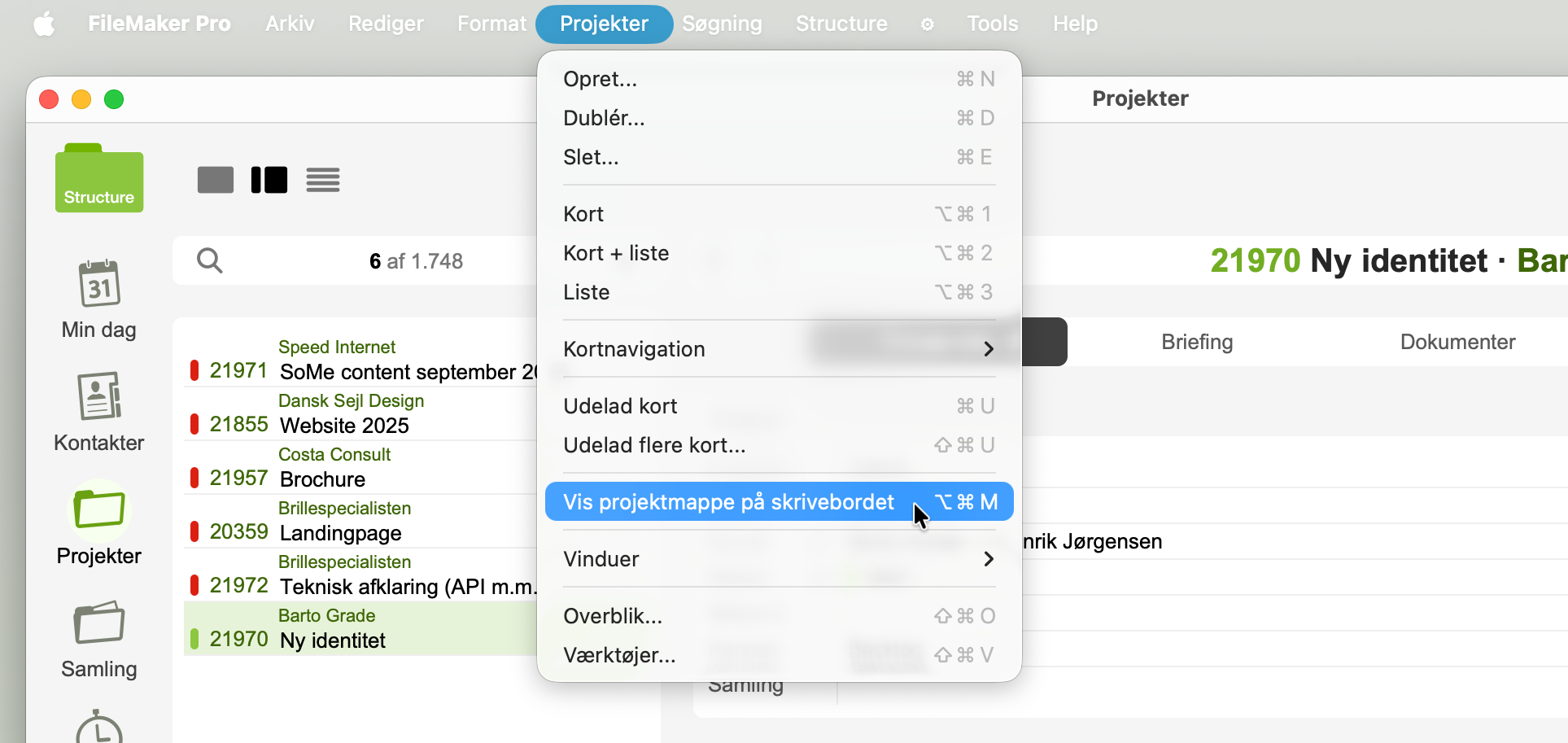 Alle primære moduler har en menu, som er helt specfik for det pågældende modul. F.eks. er der en Projekter-menu i modulet Projekter.