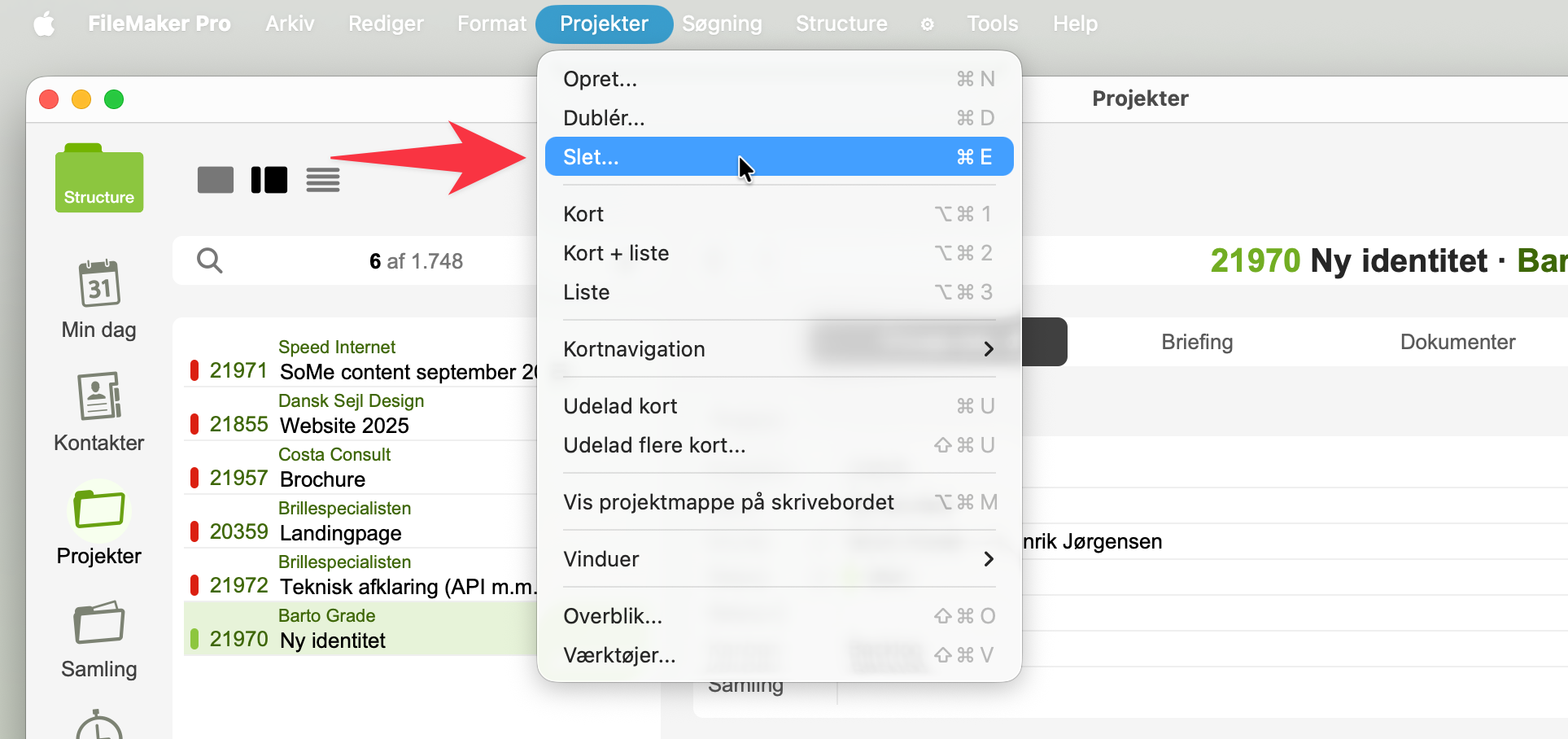 Menuen Projekter → Slet...