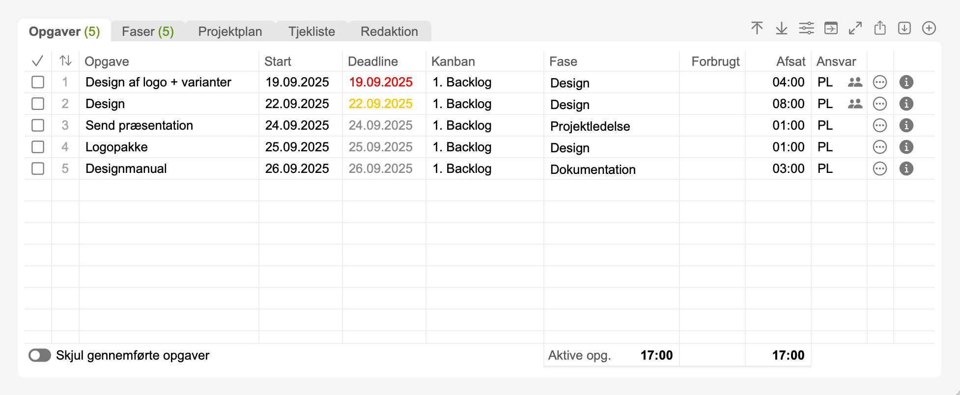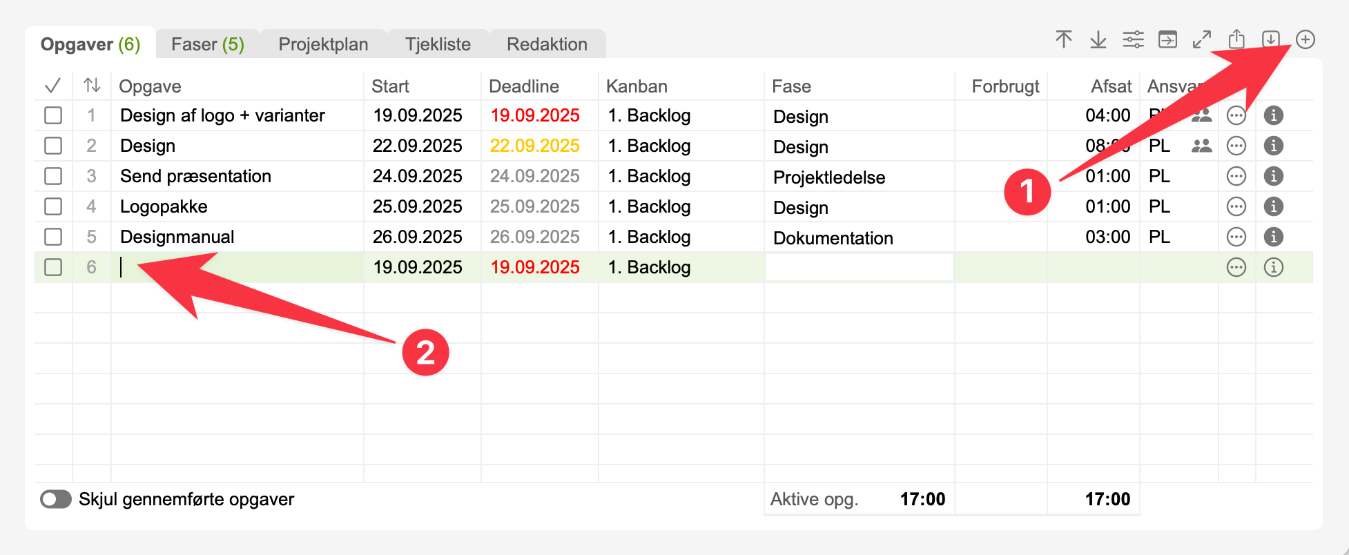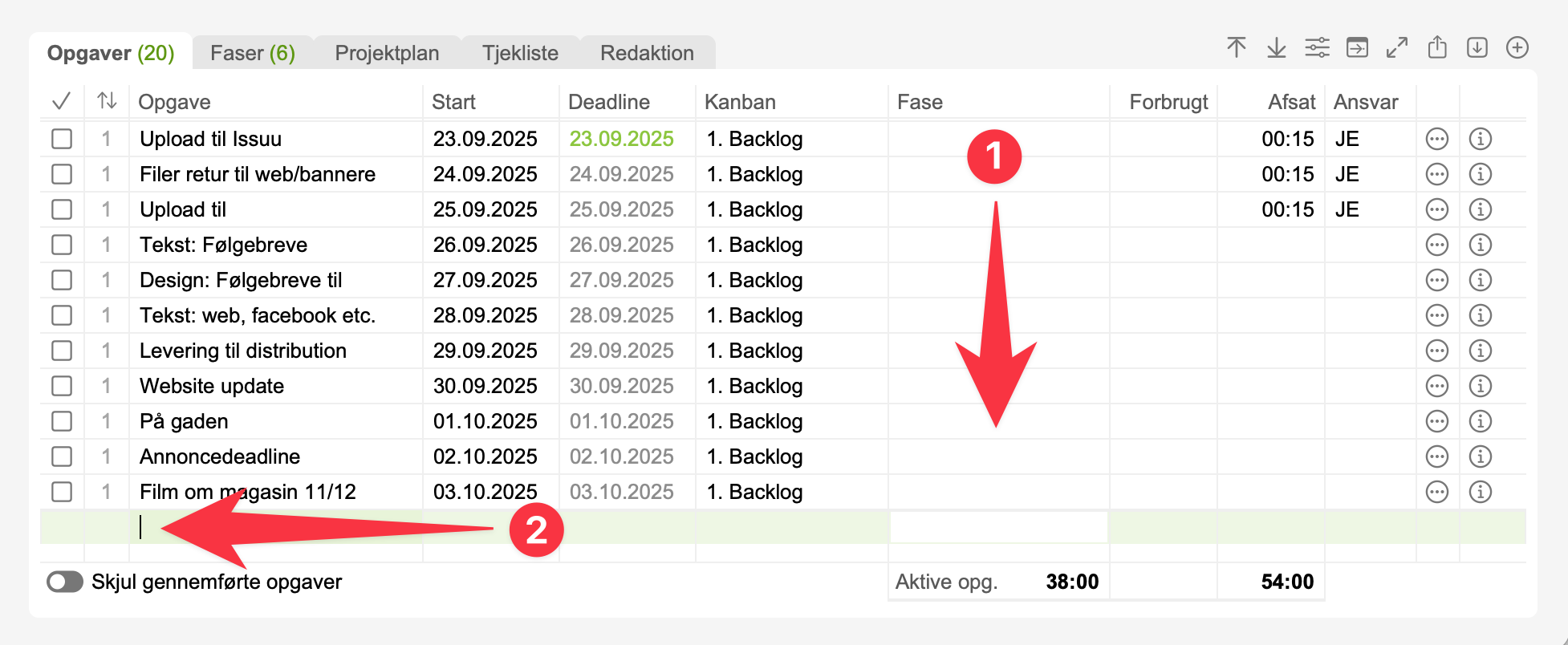 - Klik ind i feltet i den nederste ledige linje og ndtast navn på opgave (eller vælg fra dropdown-menu)
