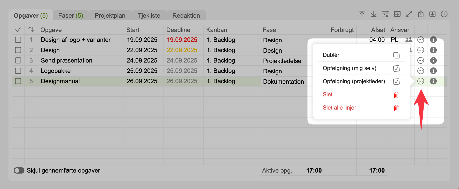 Hvis du vil slette en portallinje (det kan være en opgave eller kontaktperson), så klik på knappen Funktioner og vælg "Slet".