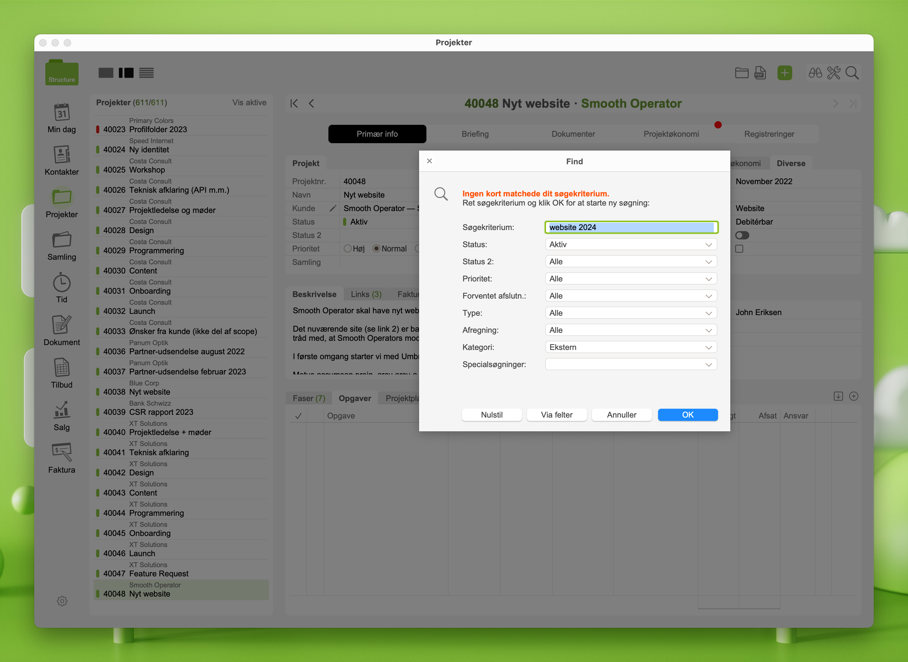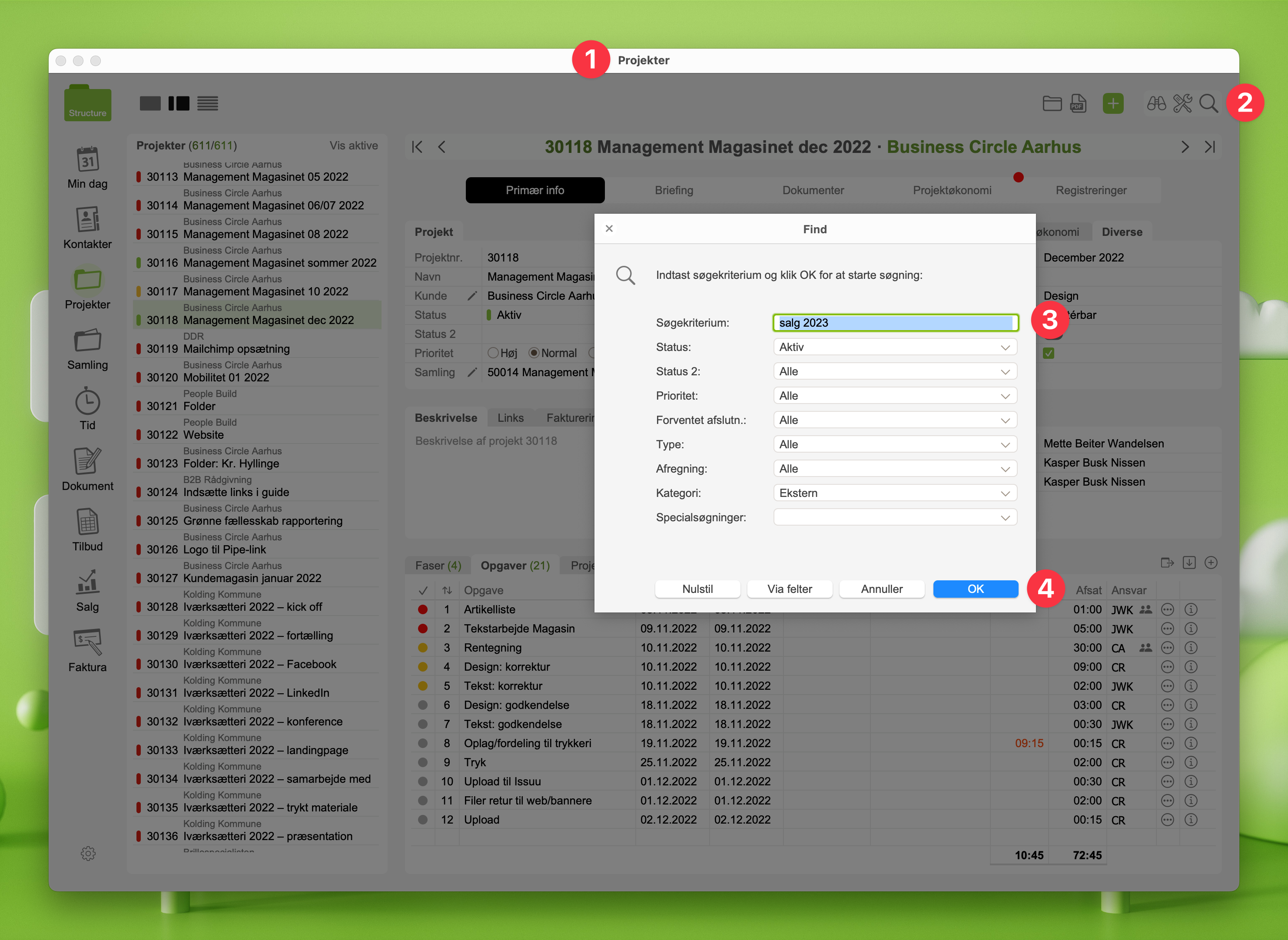 Søg-dialogboksen i Projekt-modulet