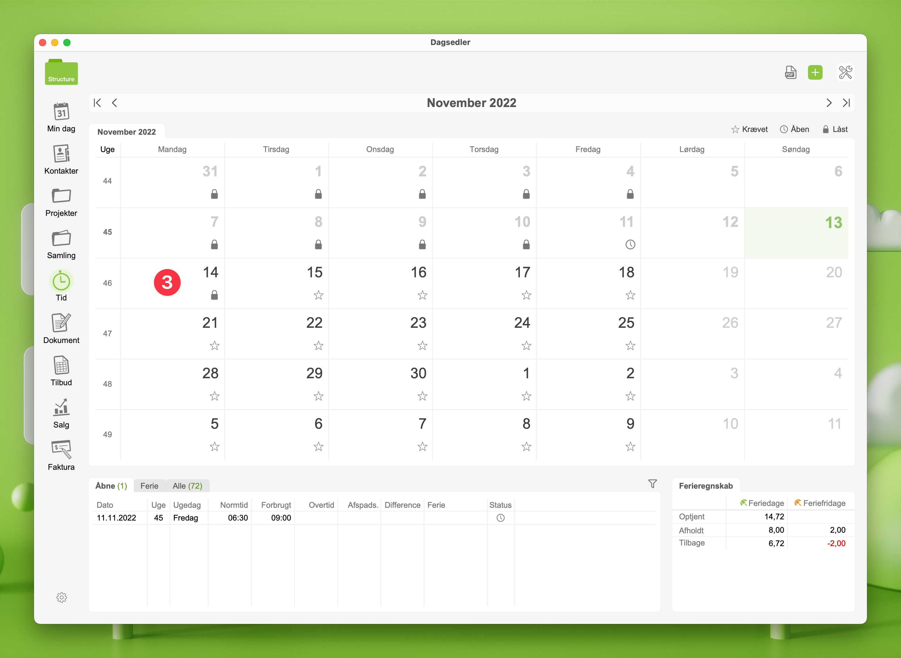 Månedsoverblikket over tidsregistrering i Structure