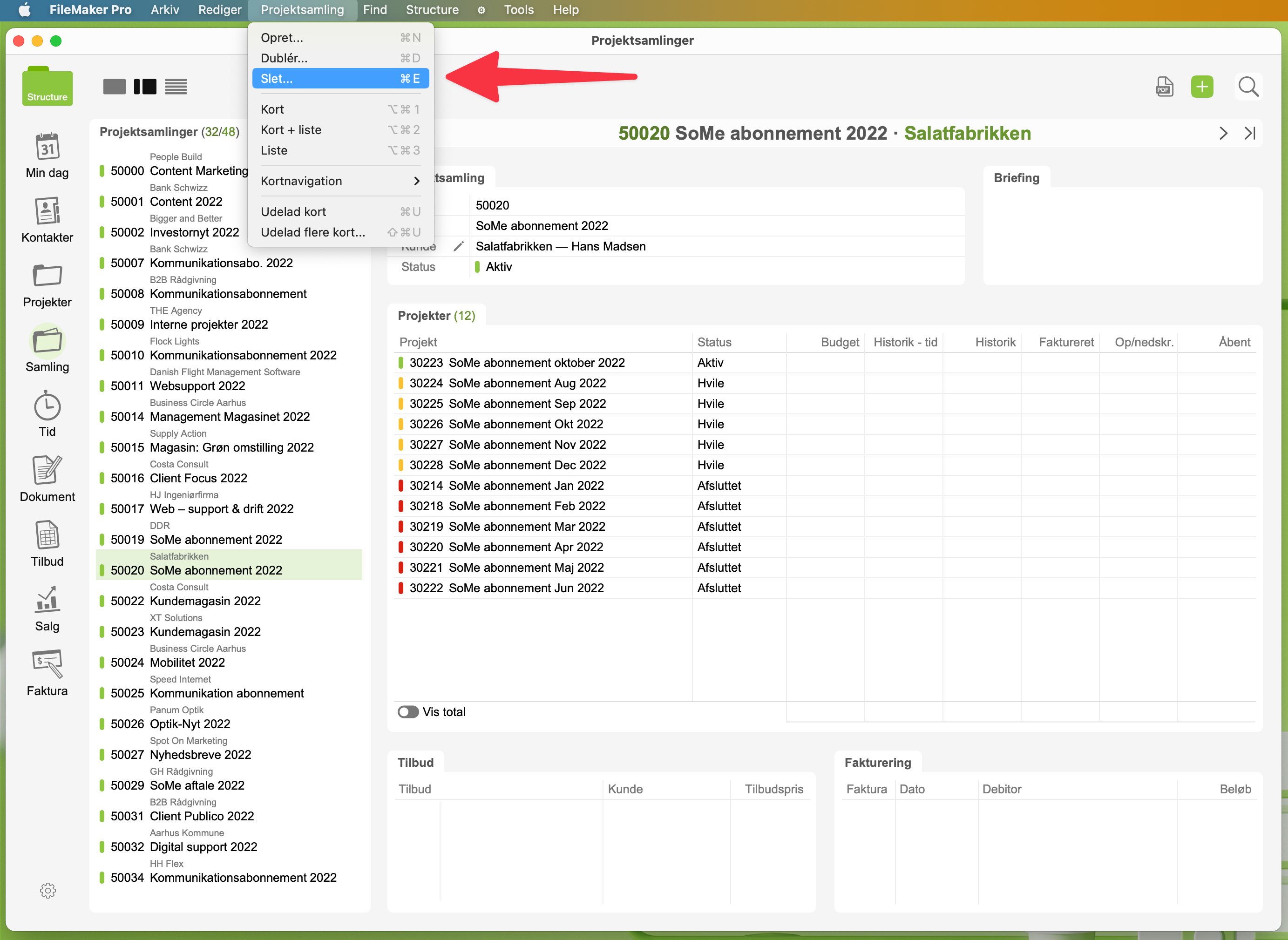 3. Når du står på det rigtige kort, så vælg menuen Projektsamling og herefter Slet...