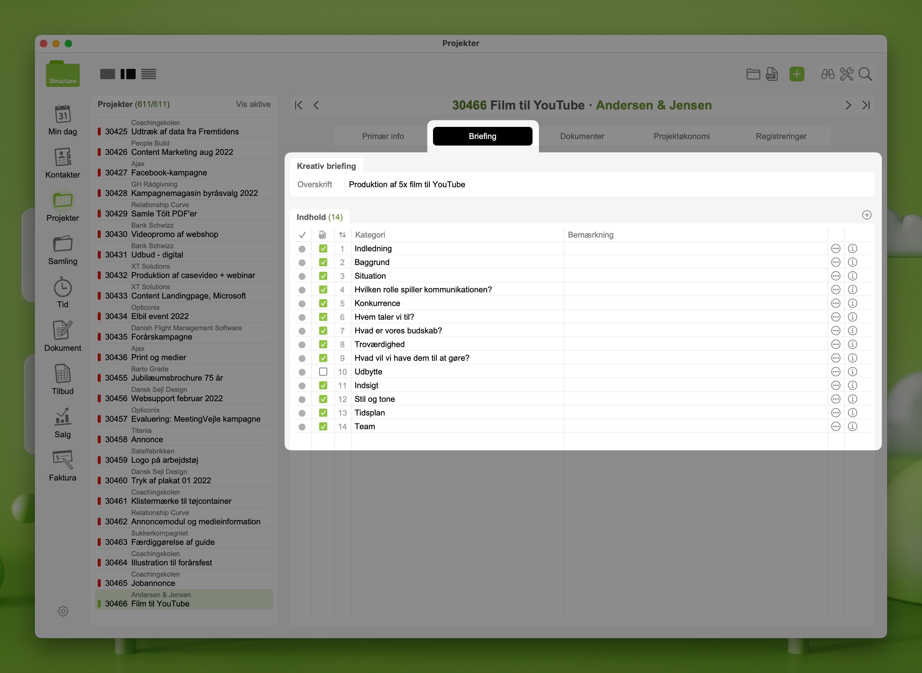 Med en kreativ briefing kan du sikre, at dit team og kunde har samme forståelse af opgaven, som skal løses. Du kan indsætte kreativ briefing baseret på skabelon og via spørgsmål understøttes processen med at skrive en kreativ briefing.