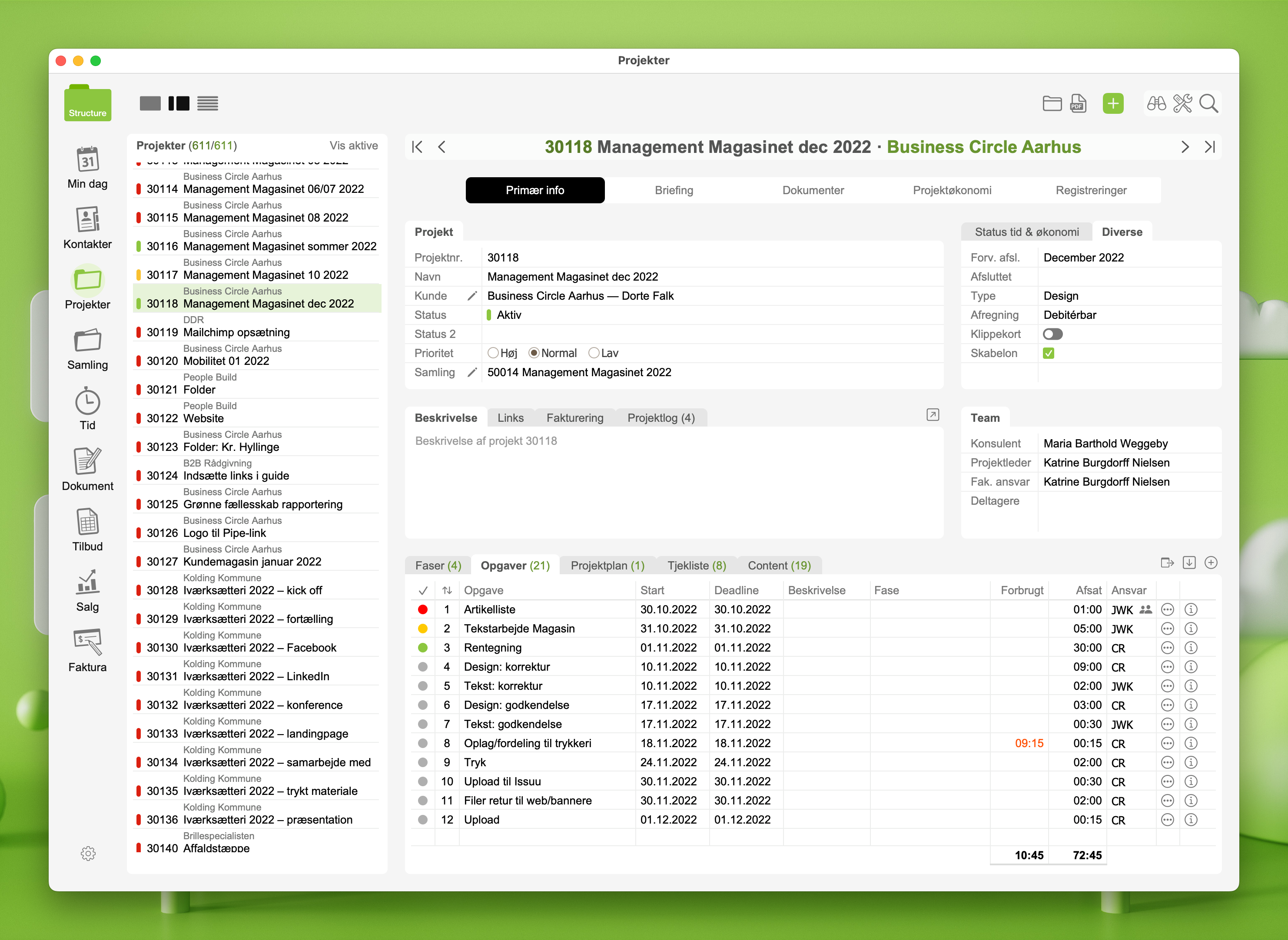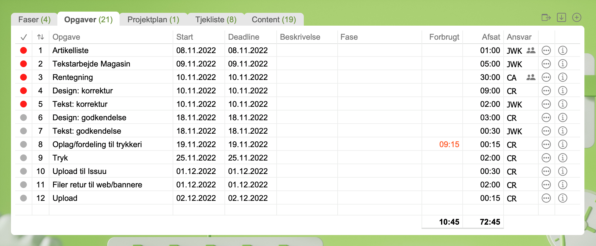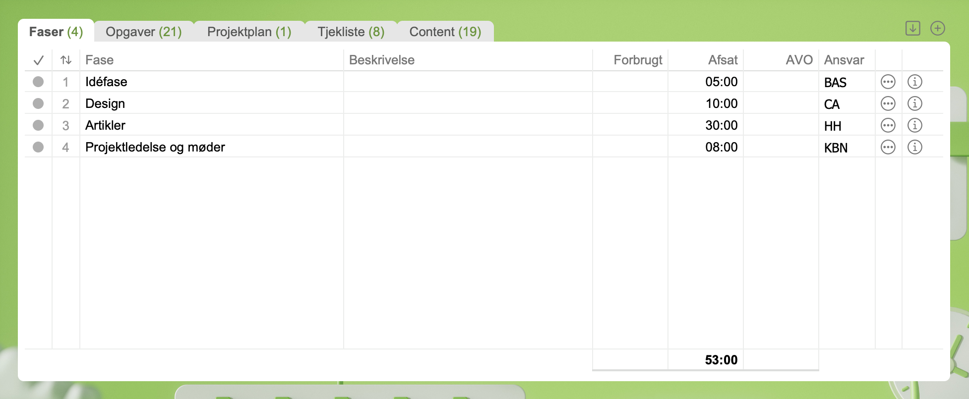 Med Faser kan du gruppere tidsforbruget på et projekt i naturlige sektioner. Når der tidsregistreres, så kan man tilknytte en fase til registreringen. Og både projektleder og medarbejder kan følge med i tidsforbruget på faserne.