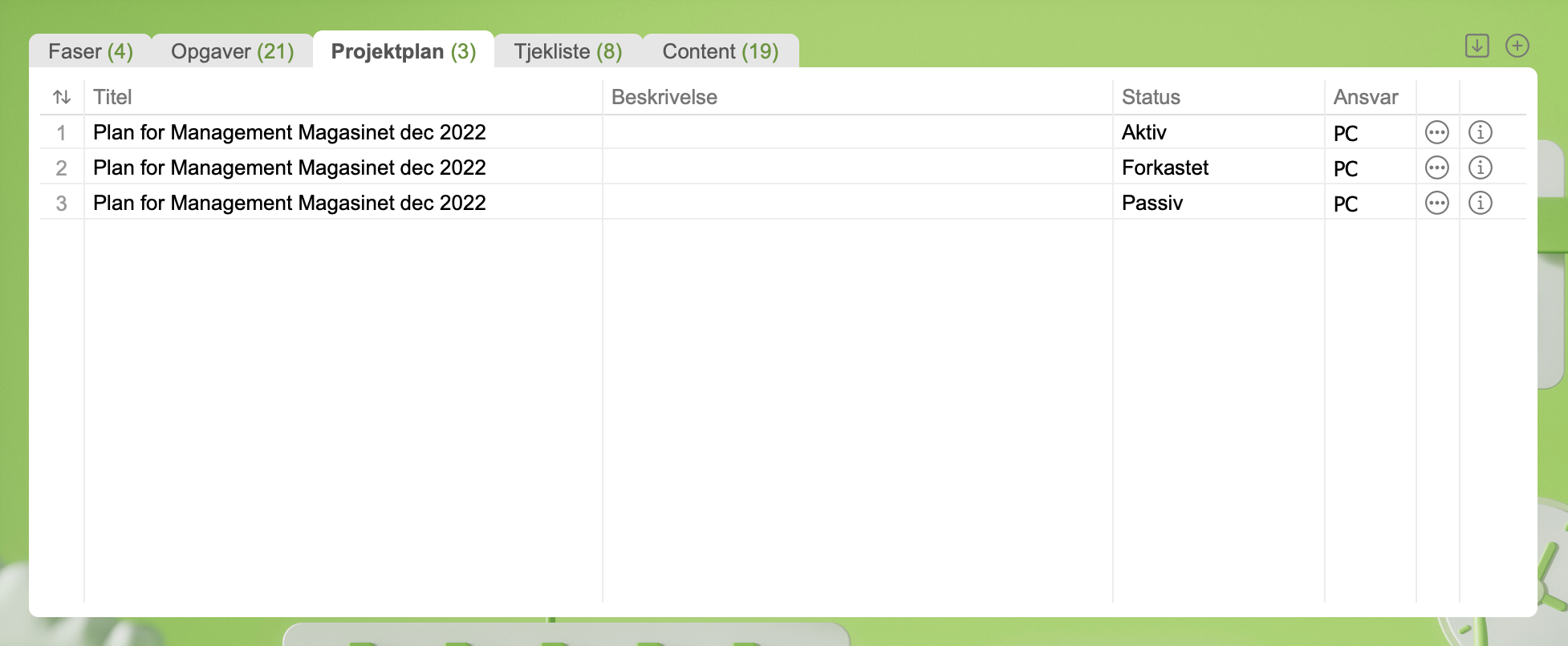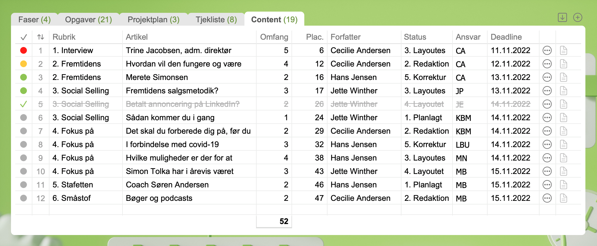 Hvis du f.eks. producerer magasiner eller bygger et website, så kan du bruge content-fanen til at styre produktionen af content. Din styring kan være "intern" hvis I selv laver hele produktionen. Men den kan også være "ekstern" og assisterende overfor en kunde, så måske har tabt overblikket over, hvad der skal produceres.