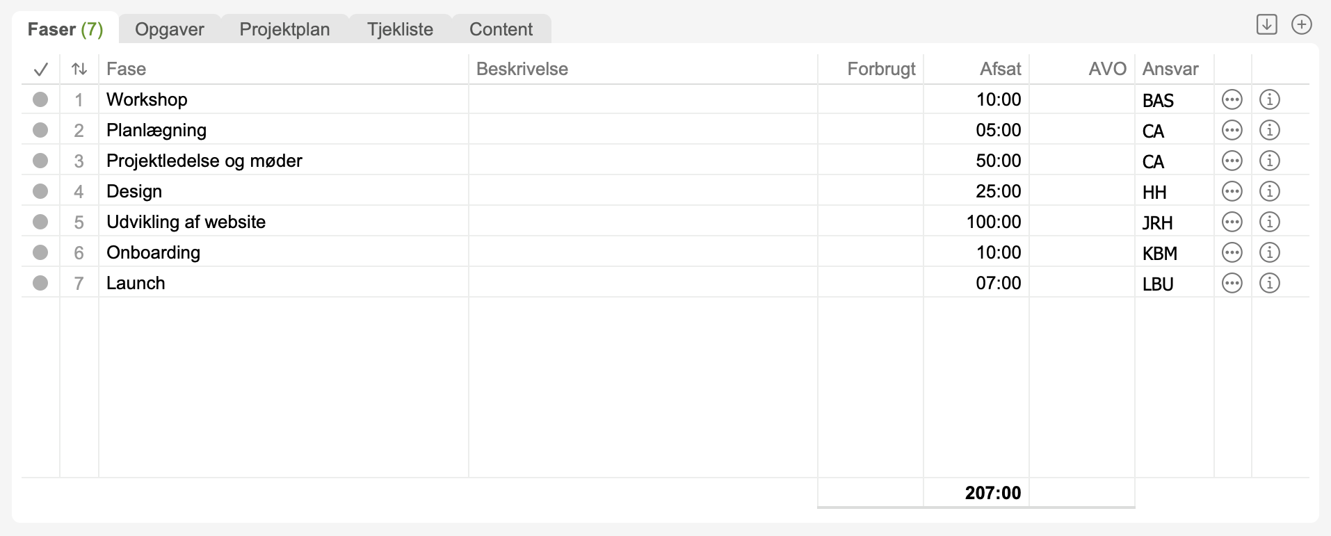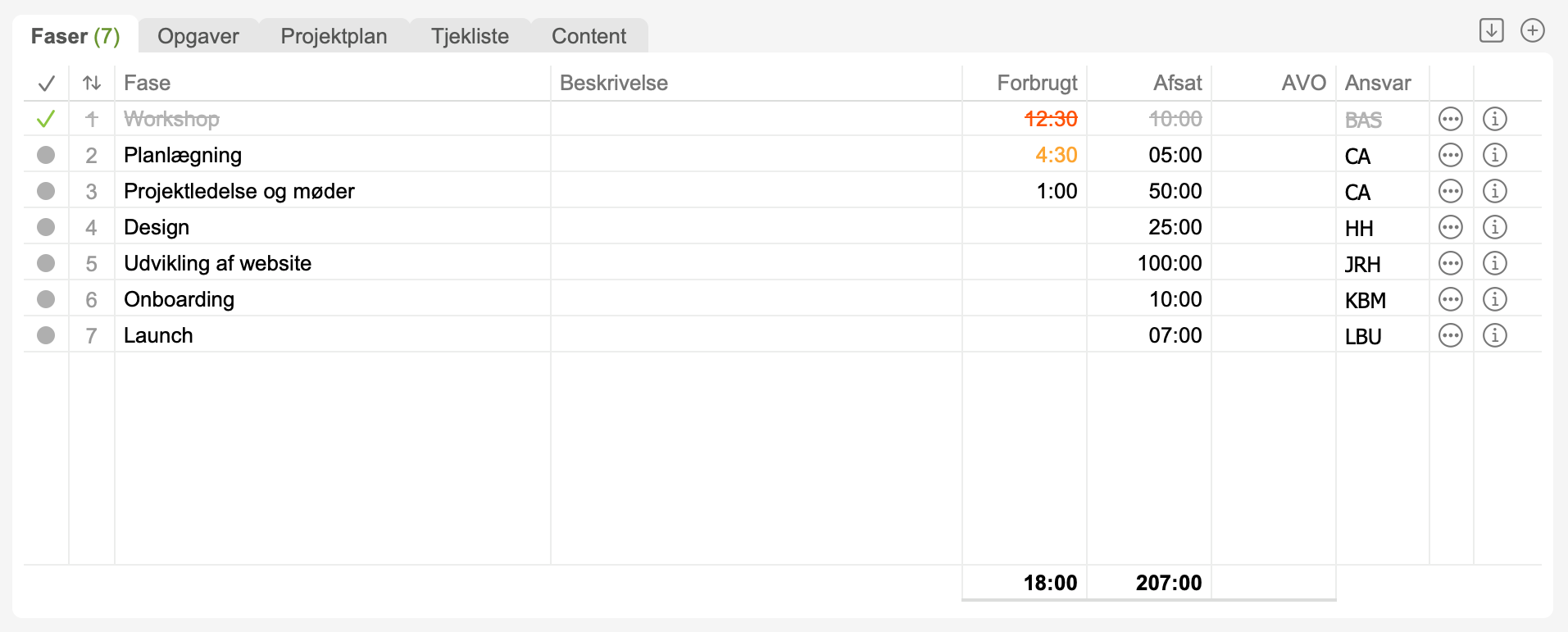 Husk at afslutte en fase, når den er færdig. Dermed kan der ikke længere tidsregistreres på den fase. Klik på den grå cirkel i første kolonne for at afslutte en fase.