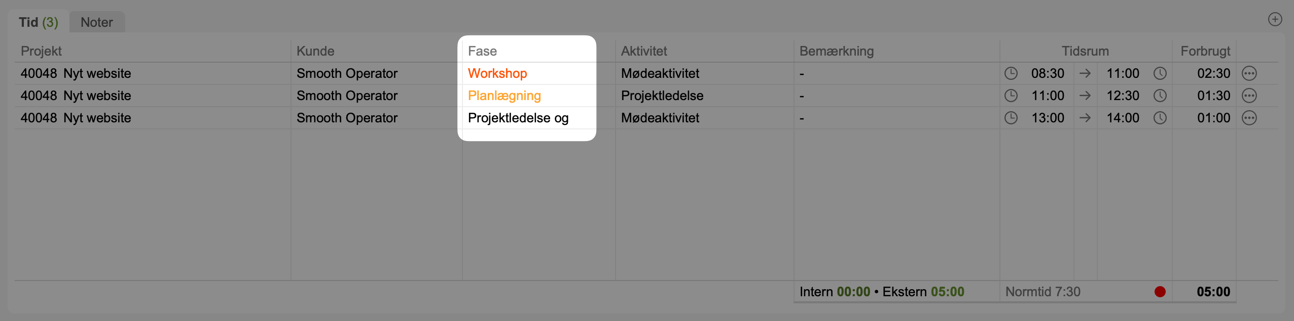Når en medarbejder tidsregistrerer på et projekt med faser, så vises de aktive faser på linjen med tid (se nedenstående screenshot).