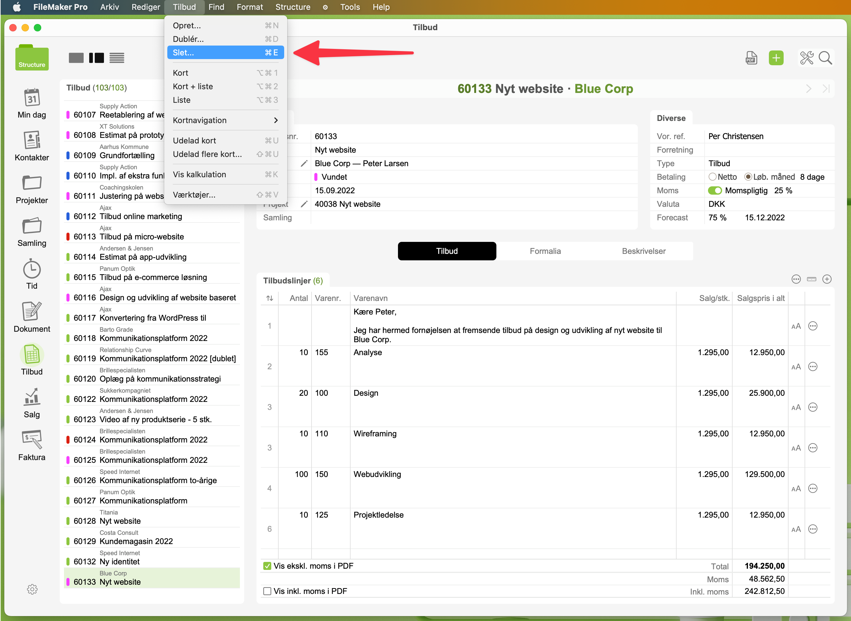 3. Når du står på det rigtige kort, så vælg menuen Tilbud og herefter Slet...