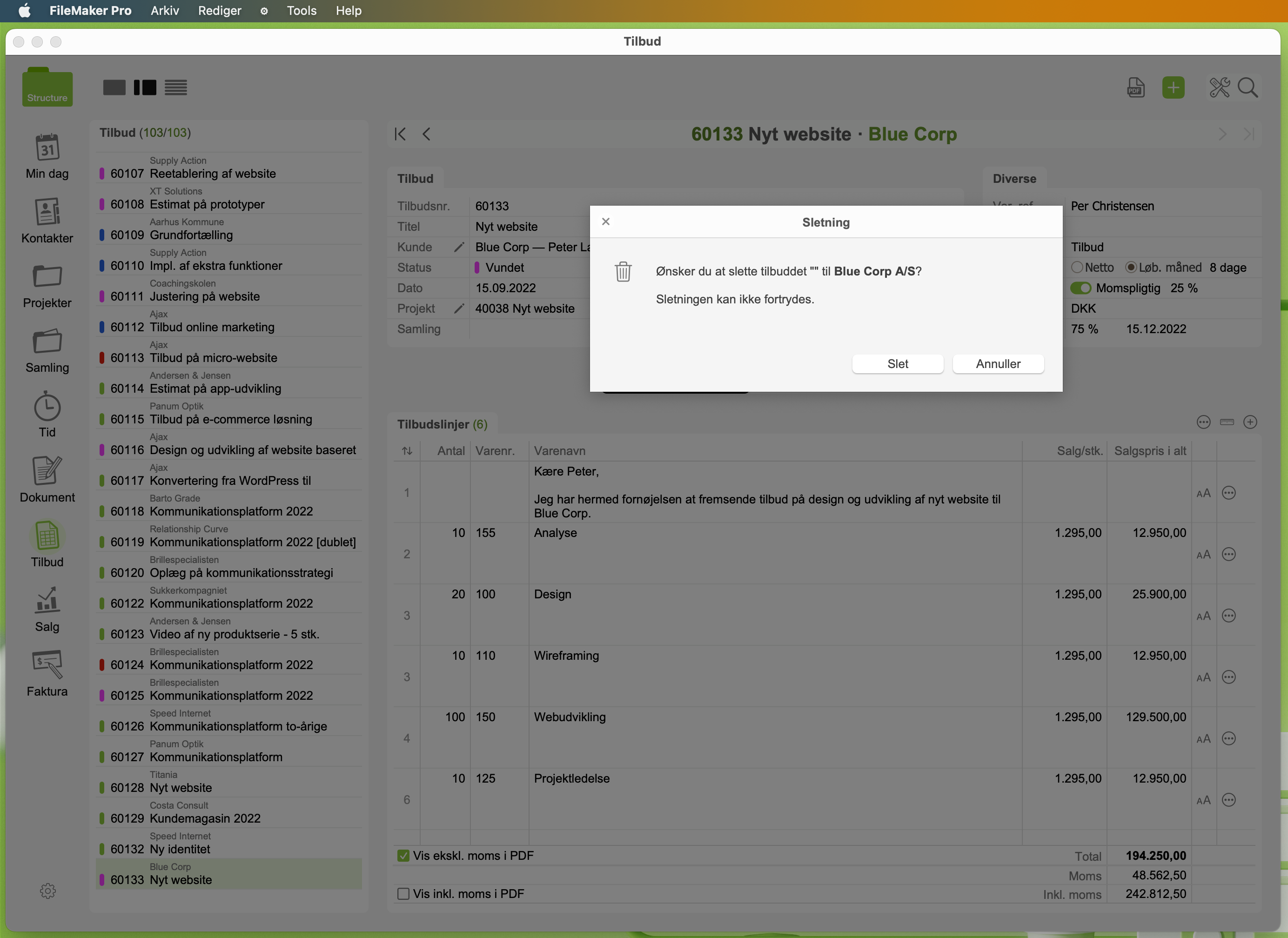 Når du sletter et tilbud, ind indskrives sletningen i Slettelog.
