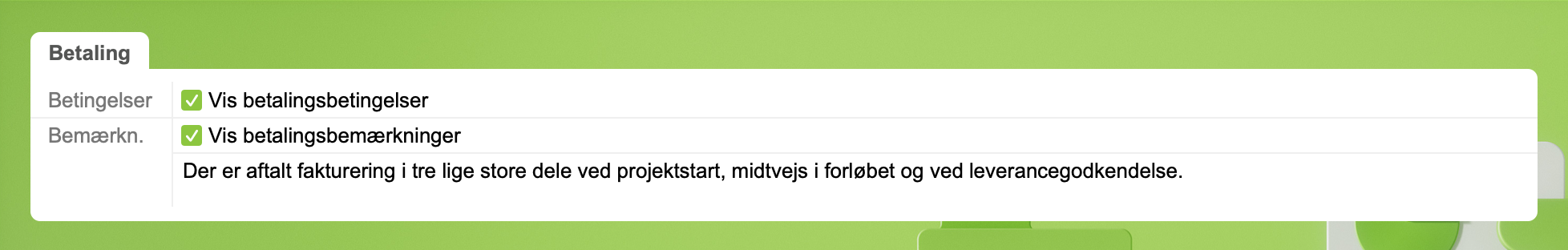 - Indtast betalingsbemærkninger og sæt kryds for visning i PDF'en efter betalingsbetingelserne