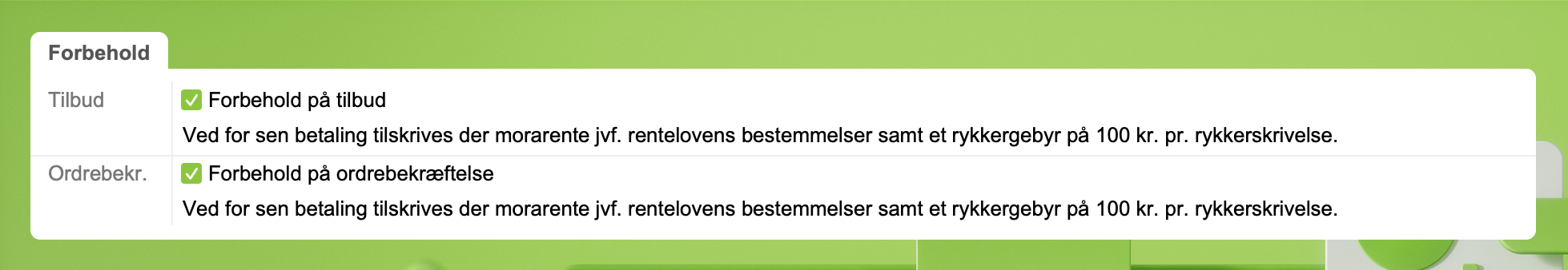 Sæt kryds hvis du vil have vist forbehold for visning i PDF'en efter sammentællingen og betalingsbetingelser.