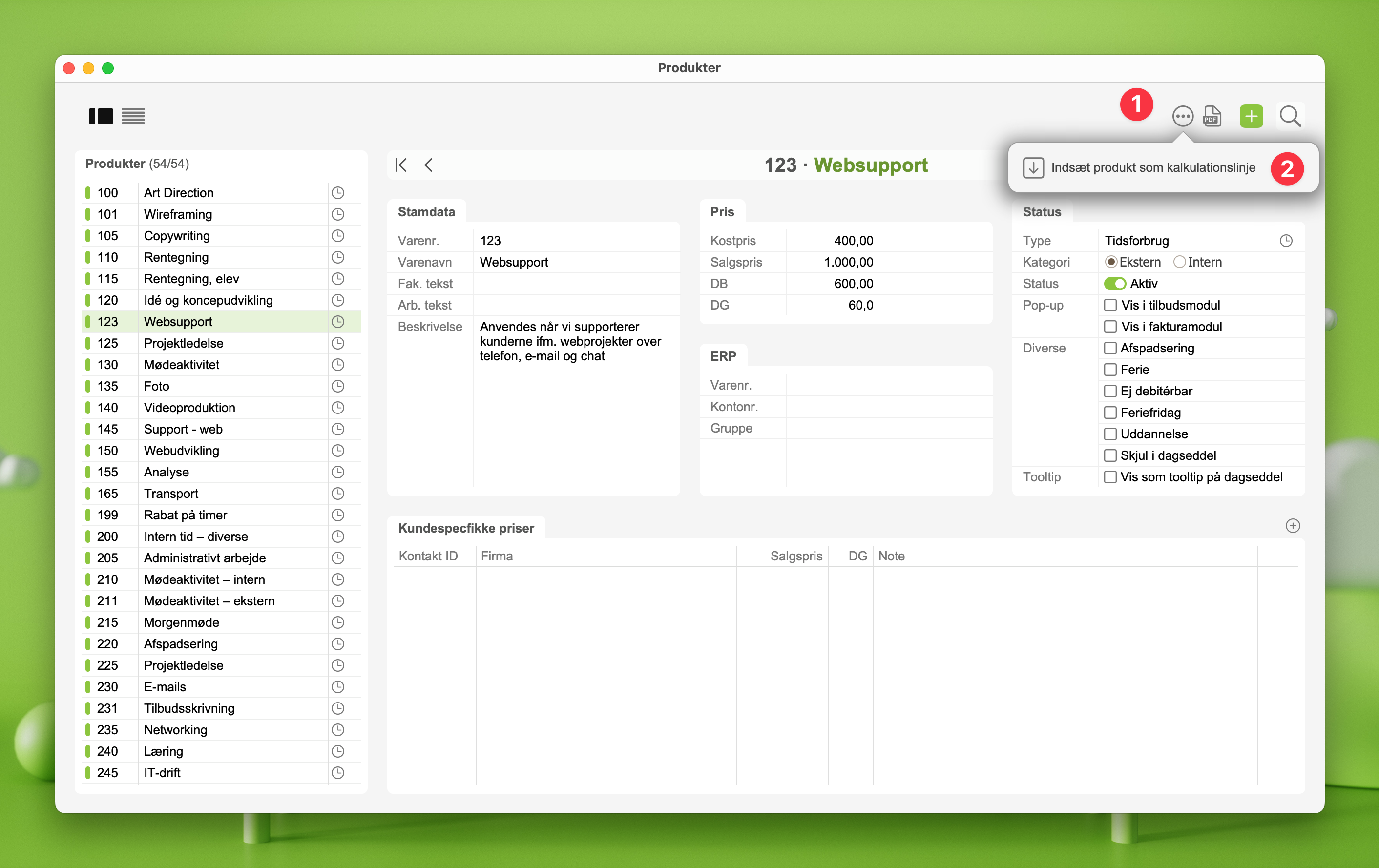 Indsæt produkt som kalkulationslinjeog bekræft valget - Det nye produkt indsættes nu på aktive projekter og kan herefter anvendes til registrering